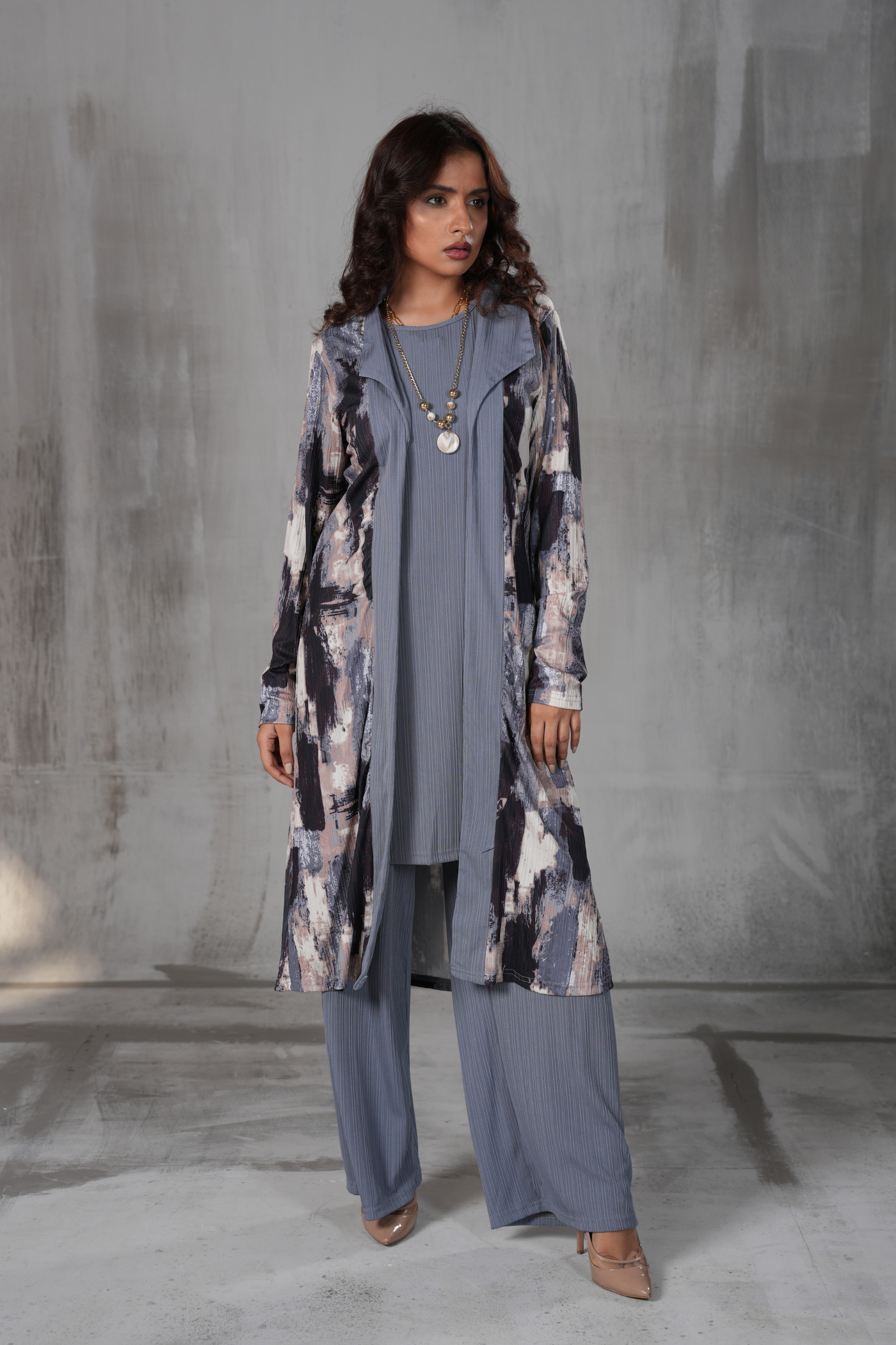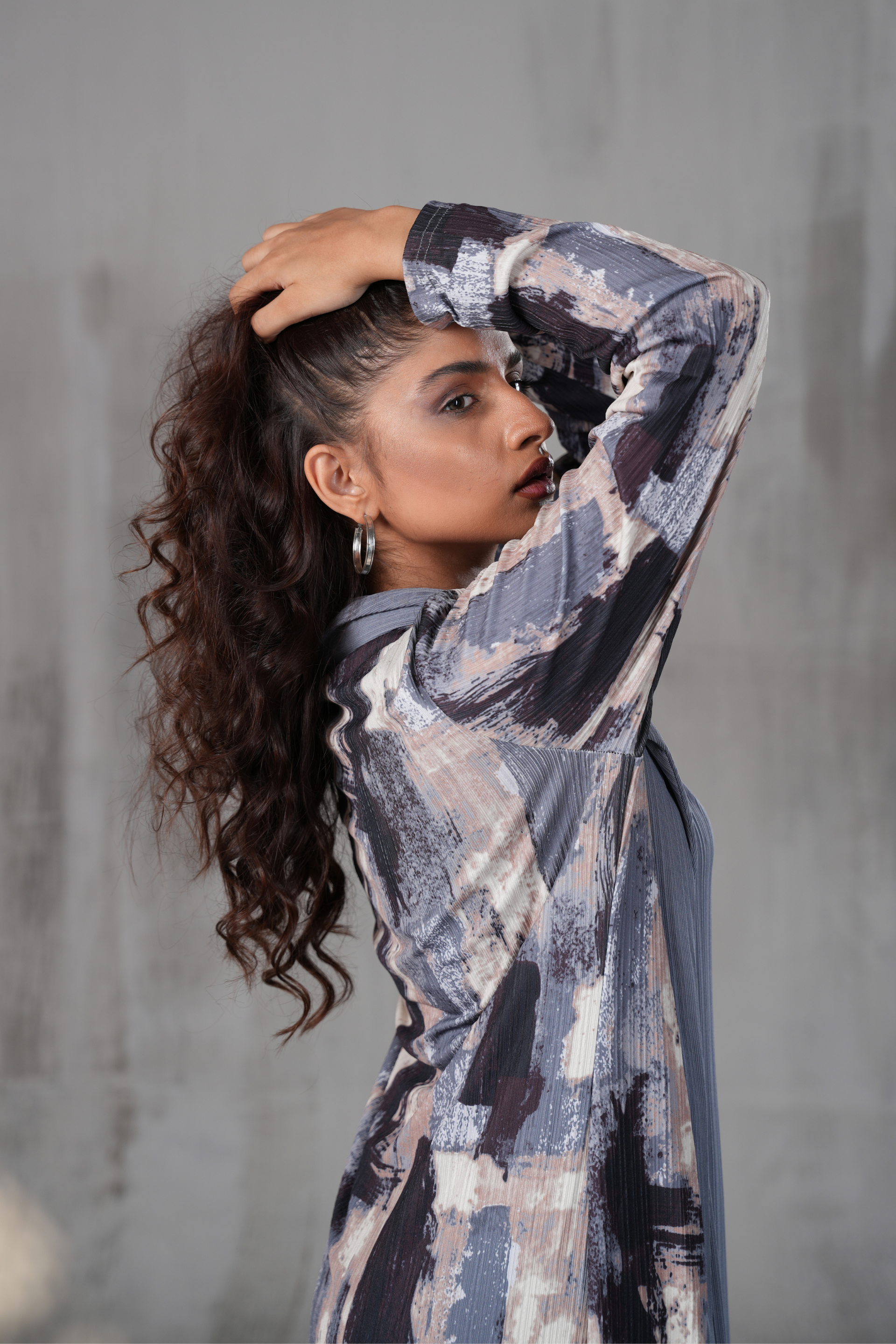Elegant Pleated 3-Piece Co-ord Set with Abstract Gown