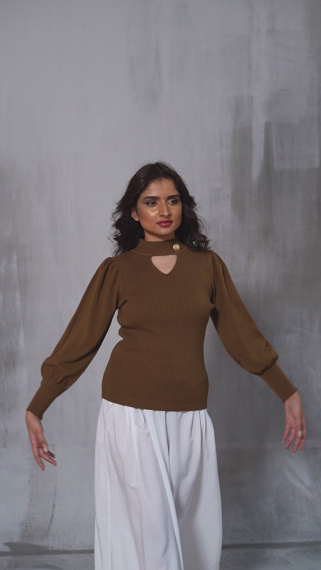 sophisticated mock neck design paired with a stylish keyhole cutout for a modern, eye-catching look.